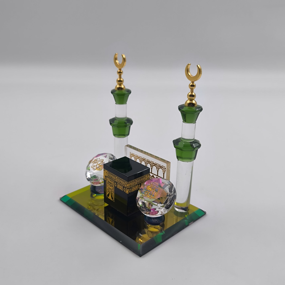Kristal Kesim Lafızlı Kabe Biblo, 8,5x6,5x10 cm boyutlarında, camdan el işçiliği ile üretilmiş şık bir dekoratif üründür. Kristal kesim tasarımı sayesinde ışığa göre renk değiştirme özelliği bulunur. Ev, ofis veya ibadet alanlarına estetik bir dokunuş katar. Hem dekoratif hem fonksiyonel bir biblo seçeneğidir.